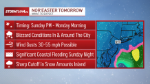 The Jersey Shore and south shore of Long Island were bracing to face the worst conditions from the storm, especially during high tide. Those areas could face 2.5 feet of inundation, while also at risk for getting some of the largest snow totals across the region — with two feet of snow possible. Power outages were also most likely along the coast.